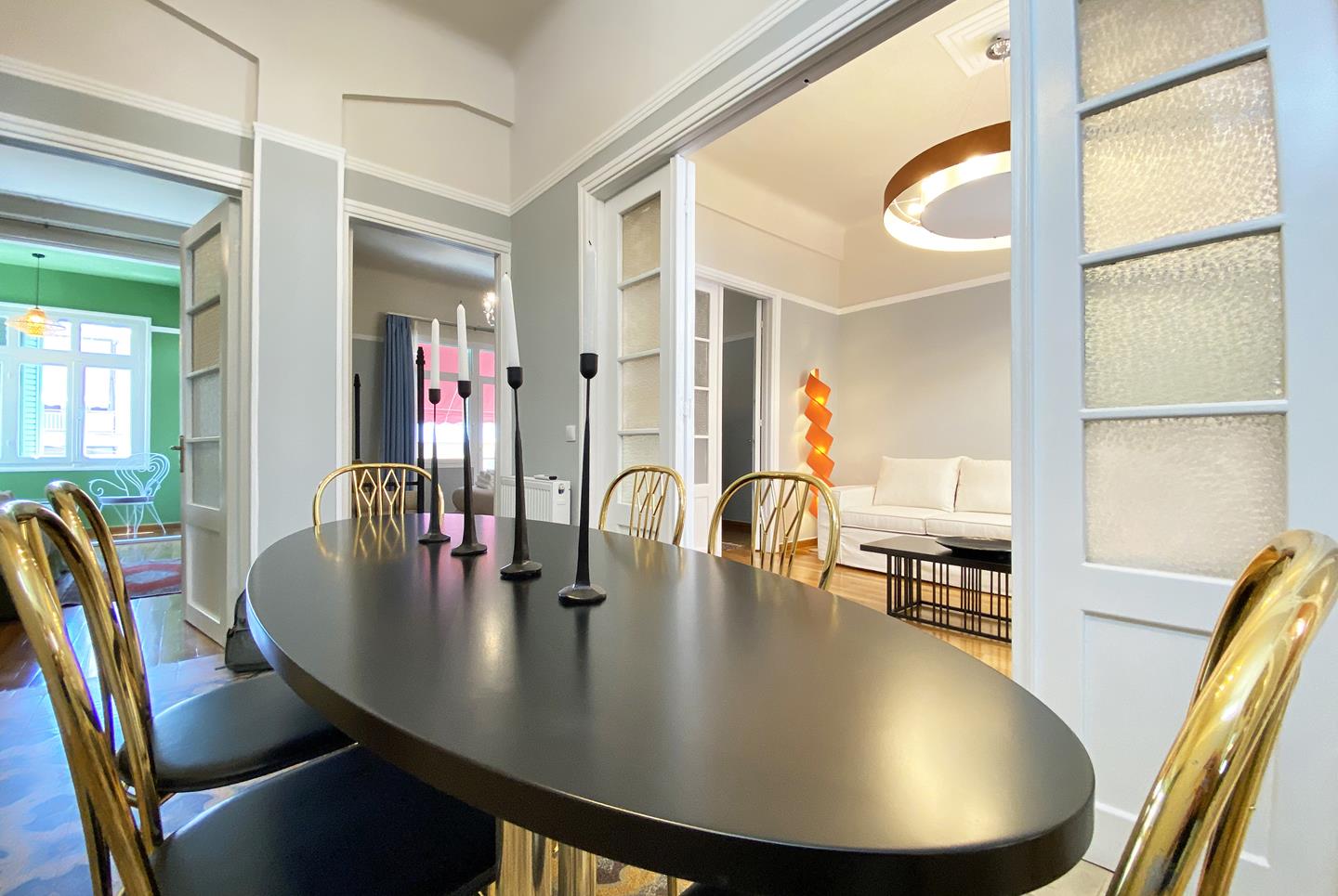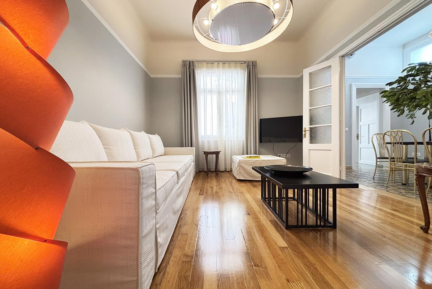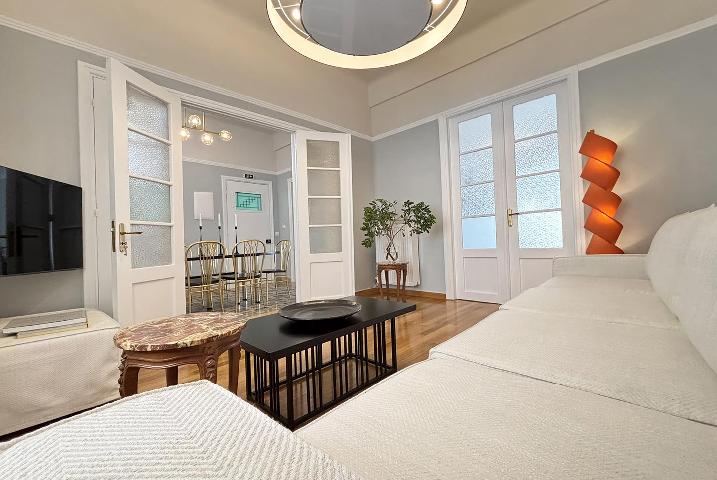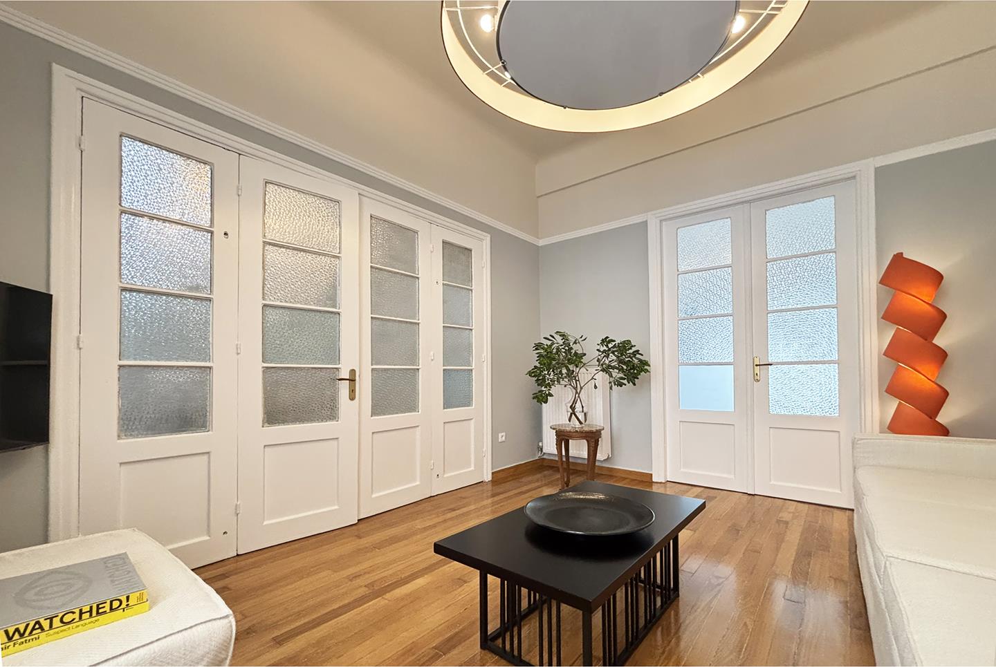 A late 19th century landmarked building fully restored in 2025. Its architectural style and design is influenced by the modernist architectural movement of Athens. Pangrati fine residence is listed as a preserved building with main characteristics: the high ceilings of 3.60 m, the plaster decoration, the preserved mosaics of the late 30s, and the signature parquet. All furniture is designed by Live in Athens.