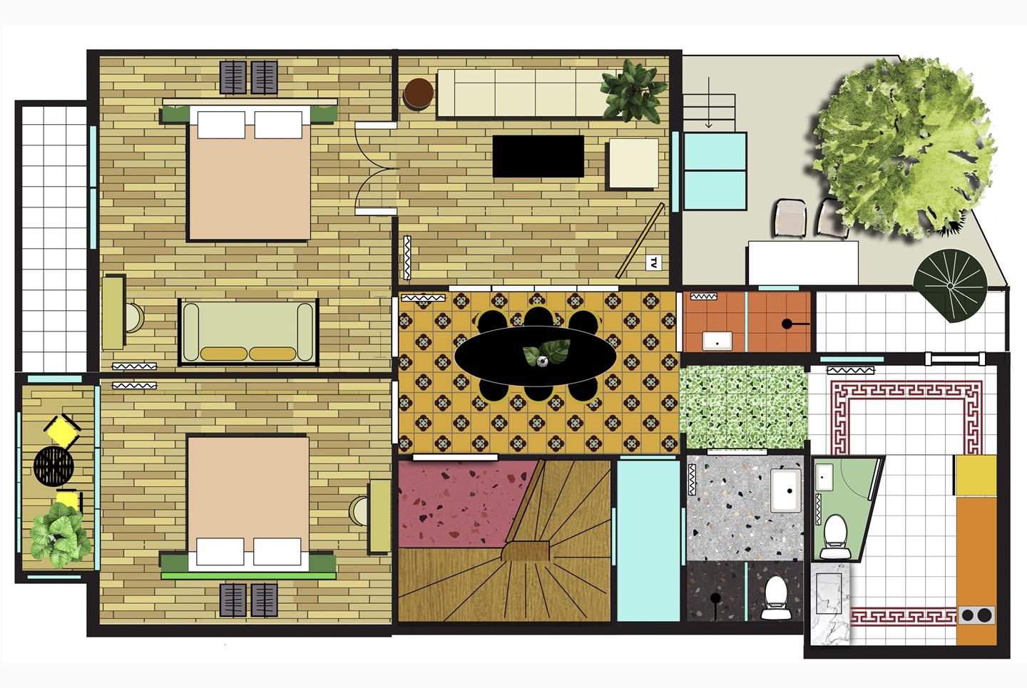 A two bedroom apartment of 93.5 sqm, with a beautiful fully furnished private courtyard on the 1st floor of the building. Ideal for 4, can host up to 7 guests.